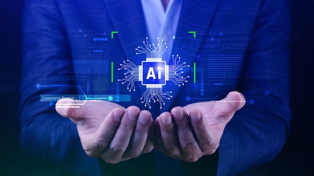 Doanh nhân công nghệ AI hiển thị đồ họa ảo Kết nối Internet toàn cầu Trò chuyện với AI Trí tuệ nhân tạo bằng cách sử dụng dấu nhắc lệnh để tạo ra thứ gì đó Chuyển đổi công nghệ tương lai