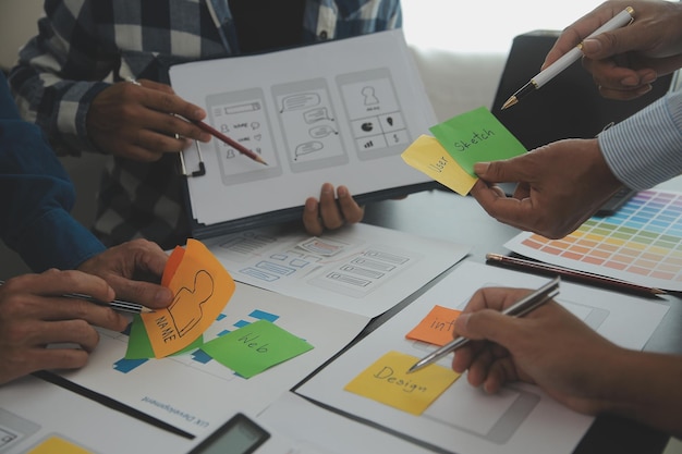 Cận cảnh nhà phát triển UX và nhà thiết kế UI động não về thiết kế wireframe giao diện ứng dụng di động trên bàn với tóm tắt của khách hàng và mã màu tại văn phòng hiện đạiCơ quan phát triển kỹ thuật số sáng tạo