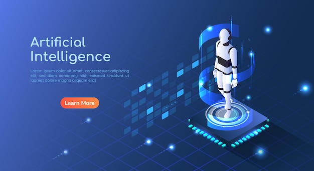 Robot Isometric với trí tuệ nhân tạo. Cơ thể điều khiển học robot làm việc với giao diện HUD ảo trong thực tế tăng cường. Khái niệm tương lai.